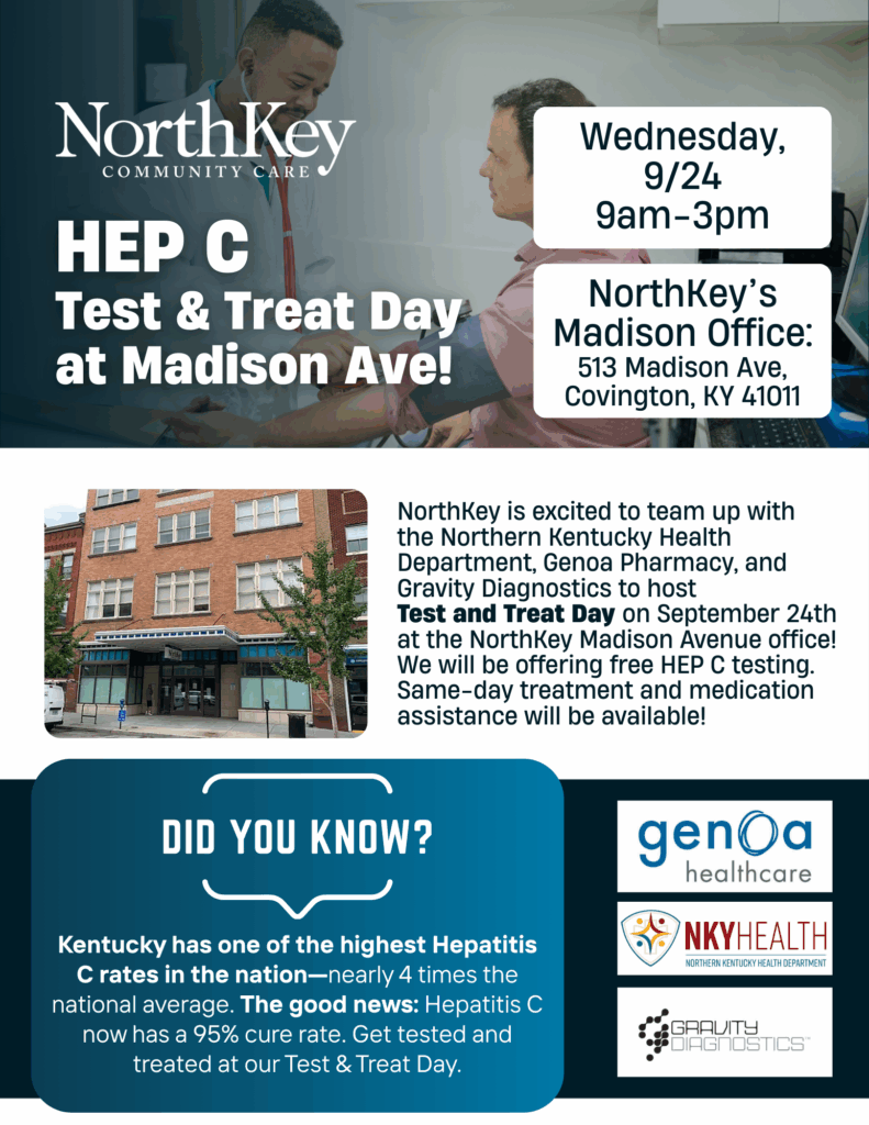 We’re teaming up with the NKY Health Department, Genoa Pharmacy, and Gravity Diagnostics to host a Hepatitis C Test and Treat Day!